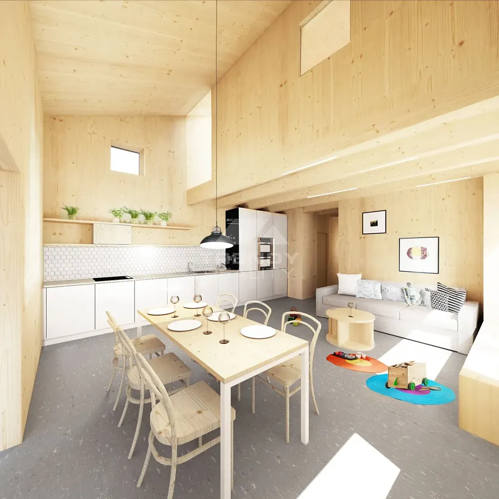 V ceně jsou kompletní projekční a realizační práce – od základové desky až po kuchyňskou linku, sanitární vybavení, podlahy, dveře a obklad v koupelně včetně základních zařizovacích předmětů. Cena je vždy s DPH.