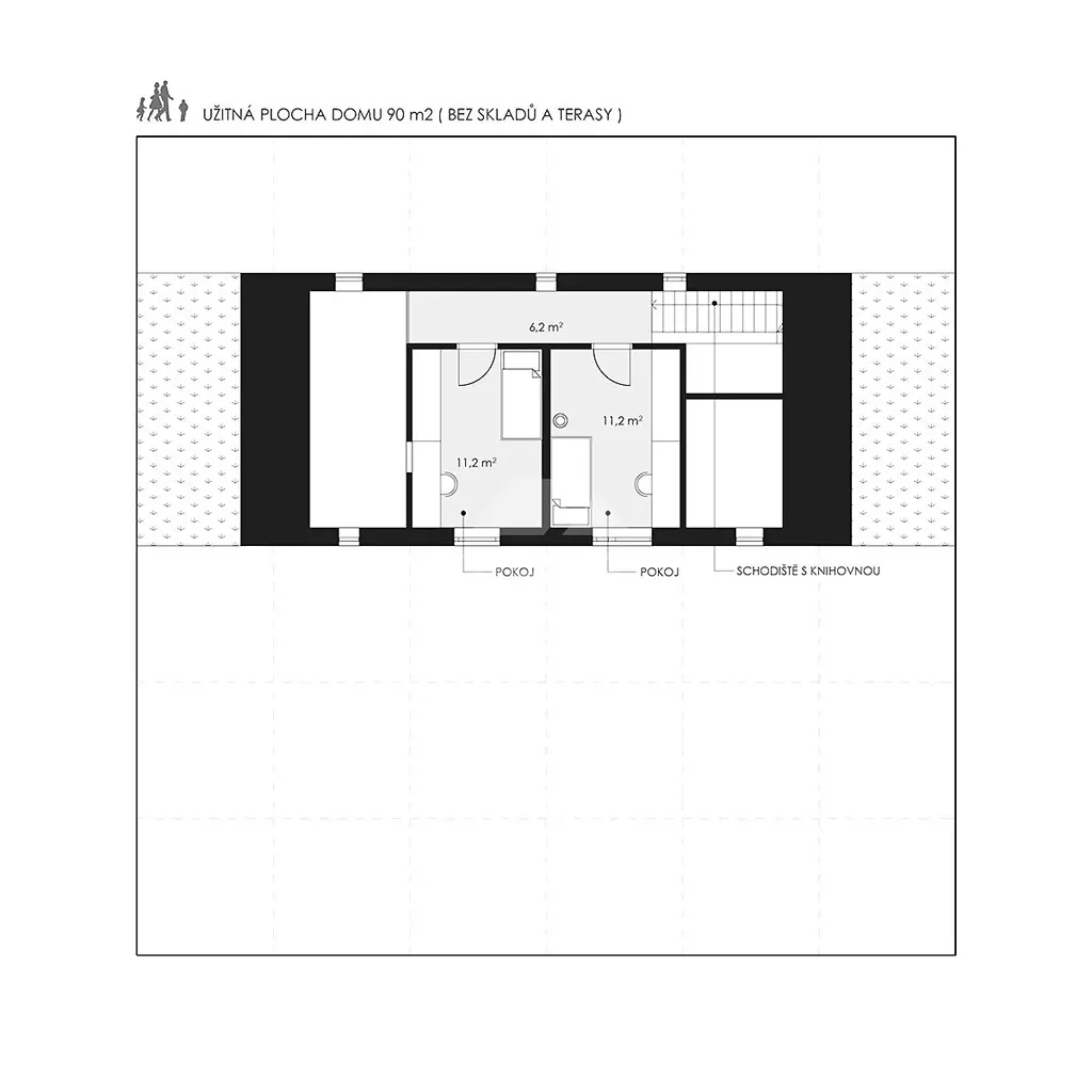 Pro čtyř- až pětičlennou rodinu: přízemí s prostorným obývacím prostorem, moderní kuchyní, ložnicí rodičů bezbariérově u koupelny, samostatným WC. Patro nabízí dětské pokoje s vlastní koupelnou a zajímavými průhledy do obýváku s vysokým stropem nad jídelnou. Krytá terasa pro letní posezení, praktický sklad 4,2 m² a úložný prostor na zahradní techniku. Nízkoenergetická konstrukce domu s podlahovým topením zajišťuje nízké náklady na provoz a maximální komfort.