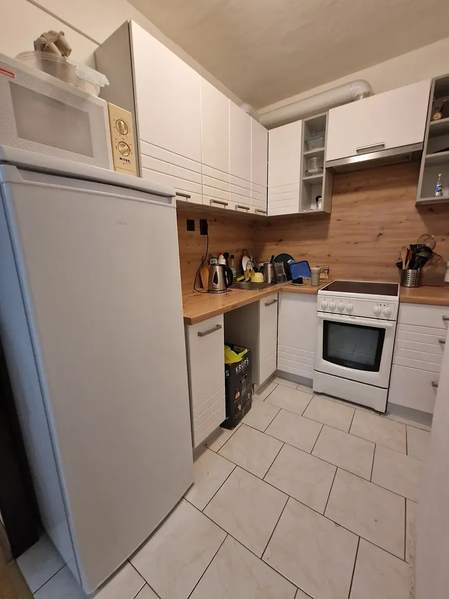 V kuchyni umístěna lednice s malým mrazákem. Dále v kuchyni umístěn elektrický sporák s elektrickou troubou.