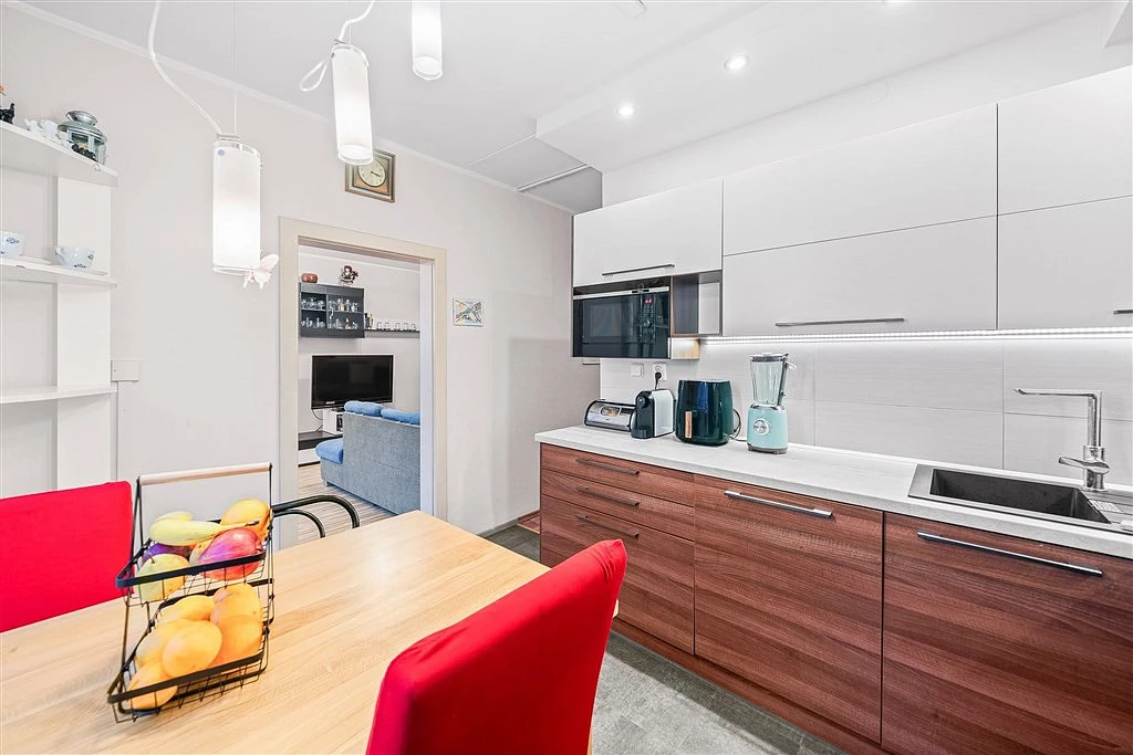 Byt prošel kompletní rekonstrukcí, která zahrnovala zejména koupelnu, toaletu a kuchyni včetně nových rozvodů, dále pak nové podlahy a interiérové dveře v celém bytě. Orientace bytu je na severní a jižní stranu; na jih je situována také lodžie o velikosti 4,4 m². V suterénu domu je k dispozici vlastní sklepní kóje o velikosti 2,9 m².