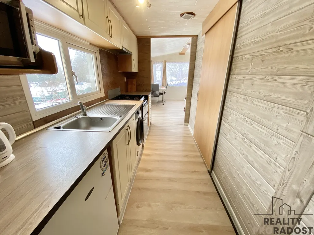 Na pozemku je umístěný mobilheim o rozměrech 48 m2, který je součástí prodeje. Mobilheim je dispozičně řešený jako 3+1, je zde kuchyně, prostorný obývací pokoj, dvě ložnice a velká koupelna s umývadlem, sprchovým koutem a WC. Mobilheim je zateplený s novou střechou. Mobilheim je napojený na elektřinu, obecní kanalizaci a vodovod. Mobilheim se vytápí elektrickými přímotopy nebo plynem, ohřev vody je zajištěn plynovou karmou . Na mobilheim navazuje terasa s výhledem do zahrady.