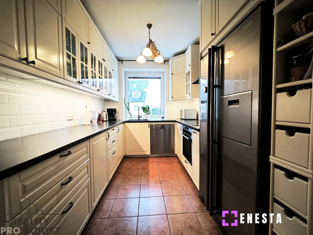 Srdcem celého domu je zvýšené přízemí, kterému dominuje prostorný obývací pokoj plynule navazující na moderní kuchyň. Kuchyňská linka ve tvaru U je vybavena vestavnými spotřebiči a praktickou americkou lednicí. Z obývací části se dostanete přímo k venkovnímu posezení. Letní pohodu a příjemný stín vám zajistí nová, velkorysá pergola ze světlého dřeva, pod níž se rozprostírá terasa s kvalitní velkoformátovou dlažbou. Na tomto patře nechybí ani samostatné WC umístěné ve vstupní hale.