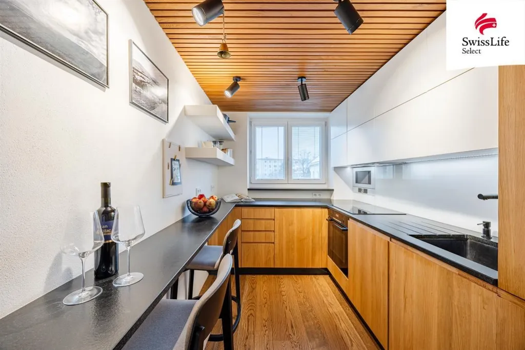 Dřevěné podlahy a podhledy s nepřímým LED osvětlením vytvářejí příjemné a útulné prostředí. Důraz byl kladen na detaily, které mají v každodenním provozu smysl zaoblené rohy stěny v ložnici podporují klidný charakter místnosti, vestavěné skříně nabízejí velkorysý úložný prostor a klimatizace zajišťuje komfort i v letních měsících, aniž by narušovala celkový vzhled interiéru. Součástí vybavení jsou také zabudované kuchyňské spotřebiče a bezpečnostní vchodové dveře s izolací.