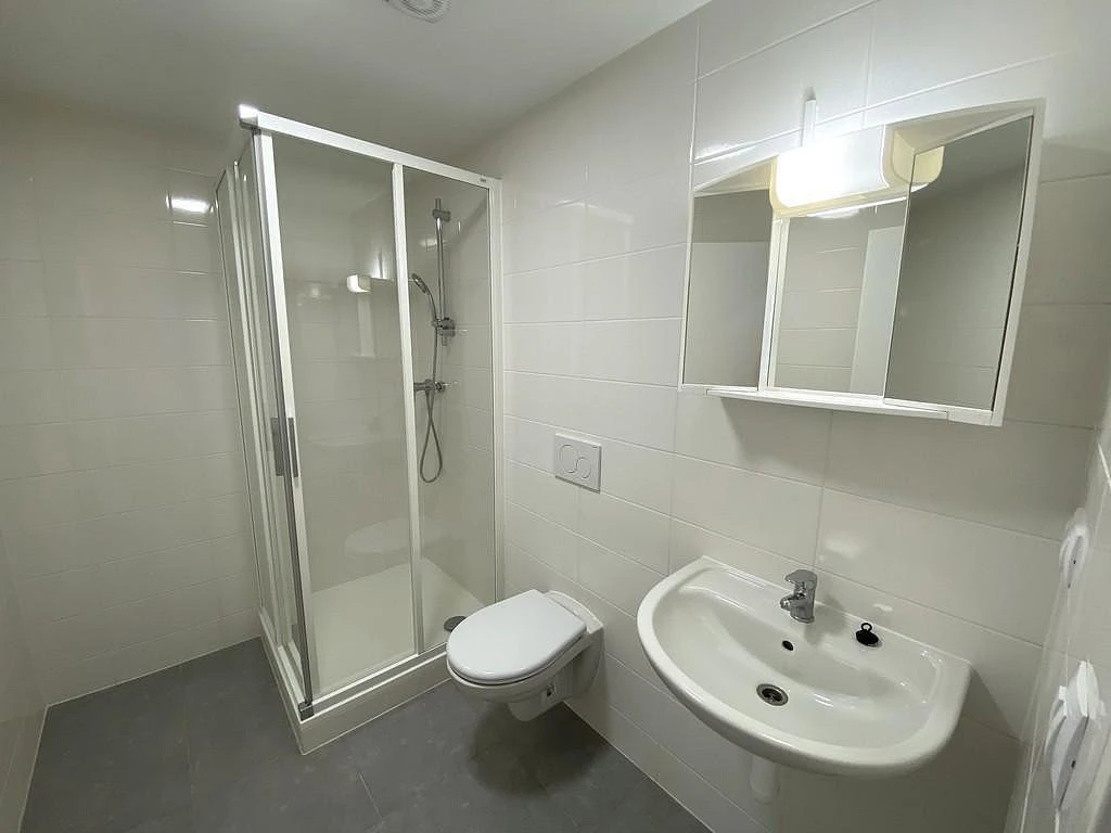 Za vstupními dveřmi bytu se nachází menší chodba, po levé straně je koupelna se sprchovým koutem, závěsnou toaletou, umyvadlem, zrcadlovou skříňkou a otopným žebříkem. Hlavní dominantou bytu je útulný obytný pokoj s kuchyňskou linkou, který vzhledem ke své velikosti lze opticky rozdělit na dvě místnosti tak jak to udělali současní nájemci. Kuchyňská linka je vybavena lednicí, dřezem a varnou dvou plotýnkou.