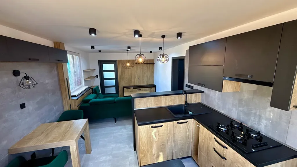 Obývací pokoj je zařízen pohodlnou sedací soupravou, konferenčním stolkem, TV stěnou a kobercem. Kuchyň je vybavena jídelním stolem a vestavěnými spotřebiči – plynovou varnou deskou, myčkou, digestoří, troubou, mikrovlnnou troubou, lednicí s mrazákem a vinotékou. Samozřejmostí je dostatek úložného prostoru a vysouvací místo pro kávovar.