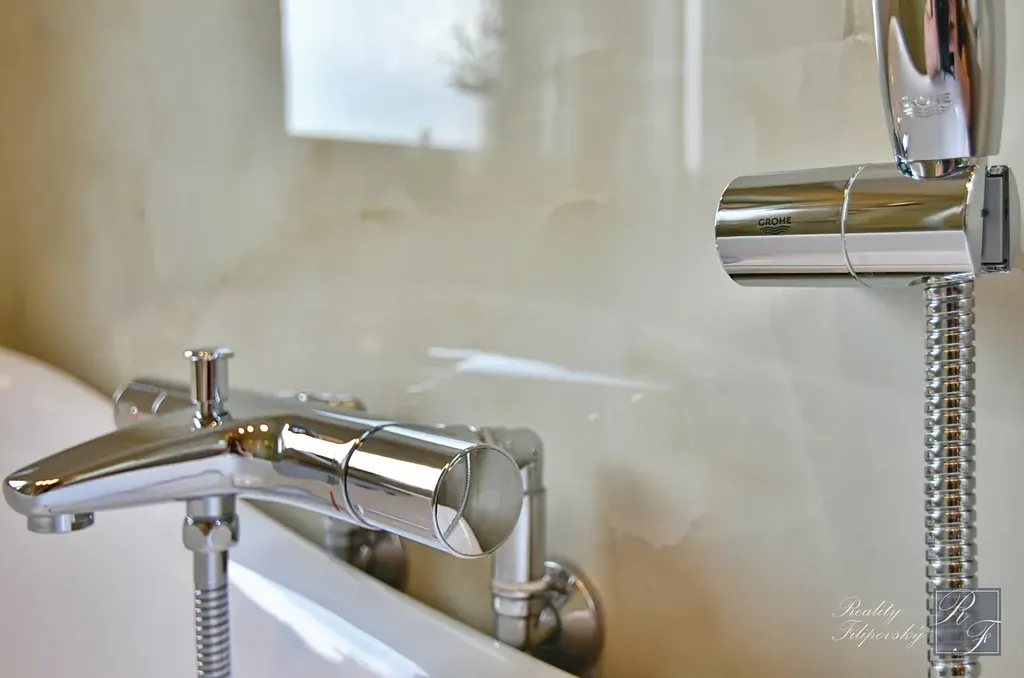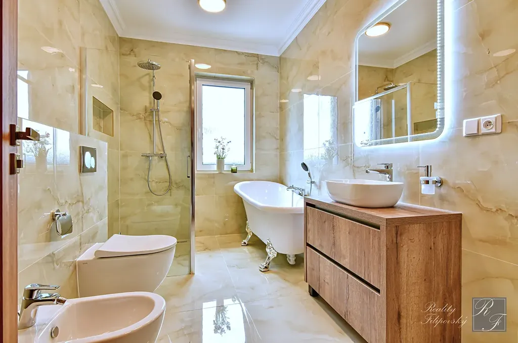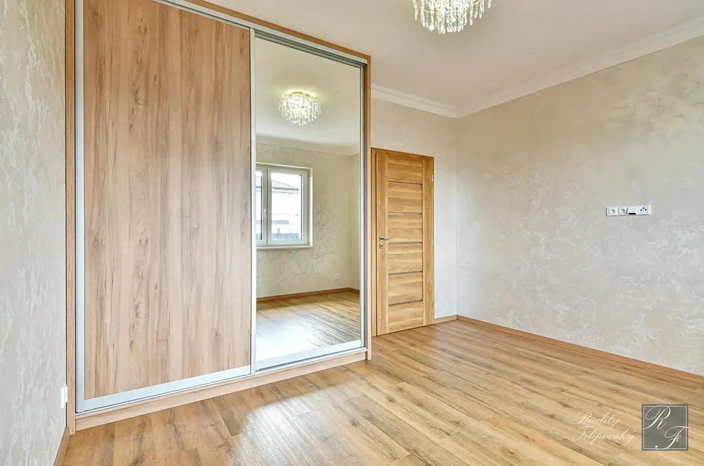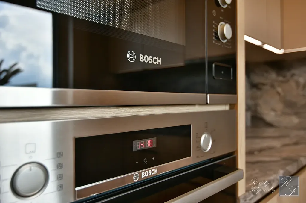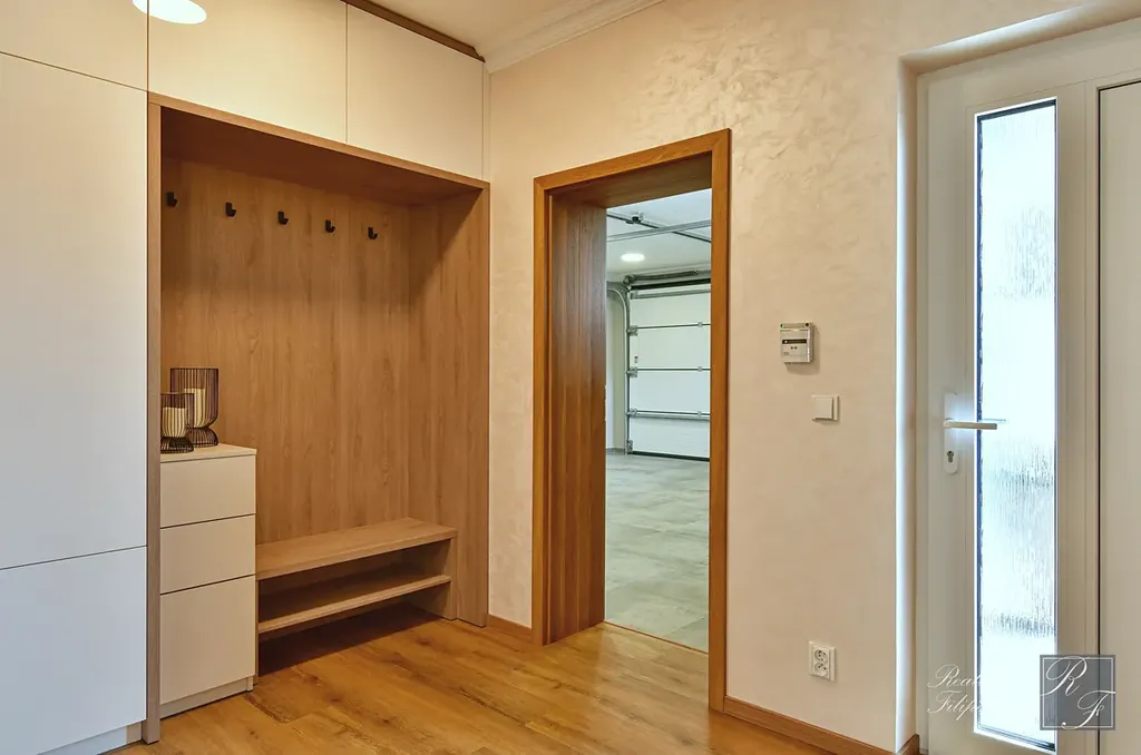 Robustní vestavné skříně jsou zhotoveny ze zdvojeného materiálu s kompletním vnitřním vybavením a automatickými dojezdy v každé z ložnic. Kuchyňská linka na míru se spotřebiči Bosch včetně spíže, která obsahuje kompletní vnitřní vybavení. Osvětlení je ve všech místnostech a je řešeno vestavným či stropním osvětlením, centrálními křišťálovými lustry a zrcadly s integrovanými led světly. V koupelnách jsou pákové a termostatické baterie zn. Grohe a Hansgrohe. Dvougaráž je osazena automatickými zateplenými sekčními garážovými vraty Trido s dálkovým i přímým ovládáním. Automatická brána na dálkové ovládání, vstupní branka s integrovanou poštovní schránkou i čelní plotové výplně jsou zn. Luxline. Obložení domu i krbu je z přírodního kamene.