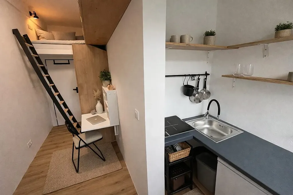 Byt je menší výměry, čemuž odpovídá i jeho velmi efektivní a promyšlené uspořádání. Hlavní obytný prostor kombinuje kuchyňský kout, pracovní/jídelní místo a obytnou část. Součástí bytu je spací patro, které výrazně šetří prostor a umožňuje oddělit spaní od denní části bytu. Kuchyň je vybavena základními spotřebiči a nabízí dostatek úložných řešení vzhledem k velikosti bytu. Koupelna je po kompletní rekonstrukci a disponuje sprchovým koutem a toaletou. Úložné prostory jsou řešeny vestavnými skříněmi a nábytkem na míru.