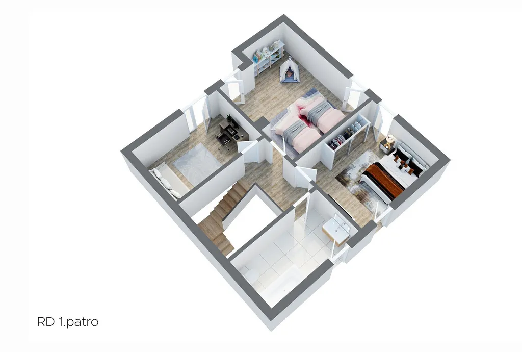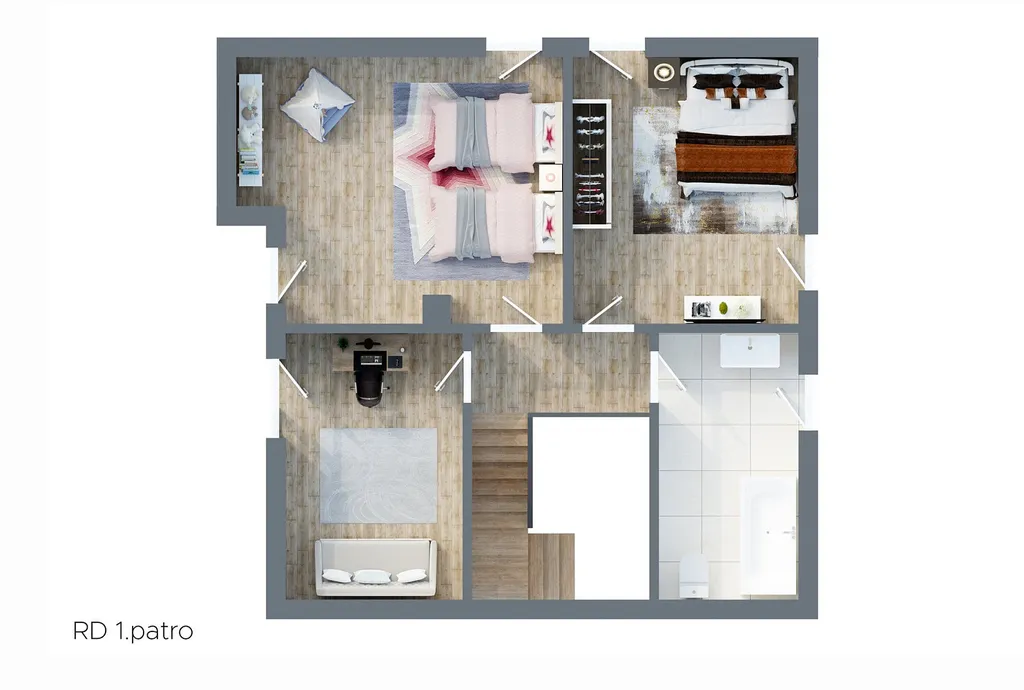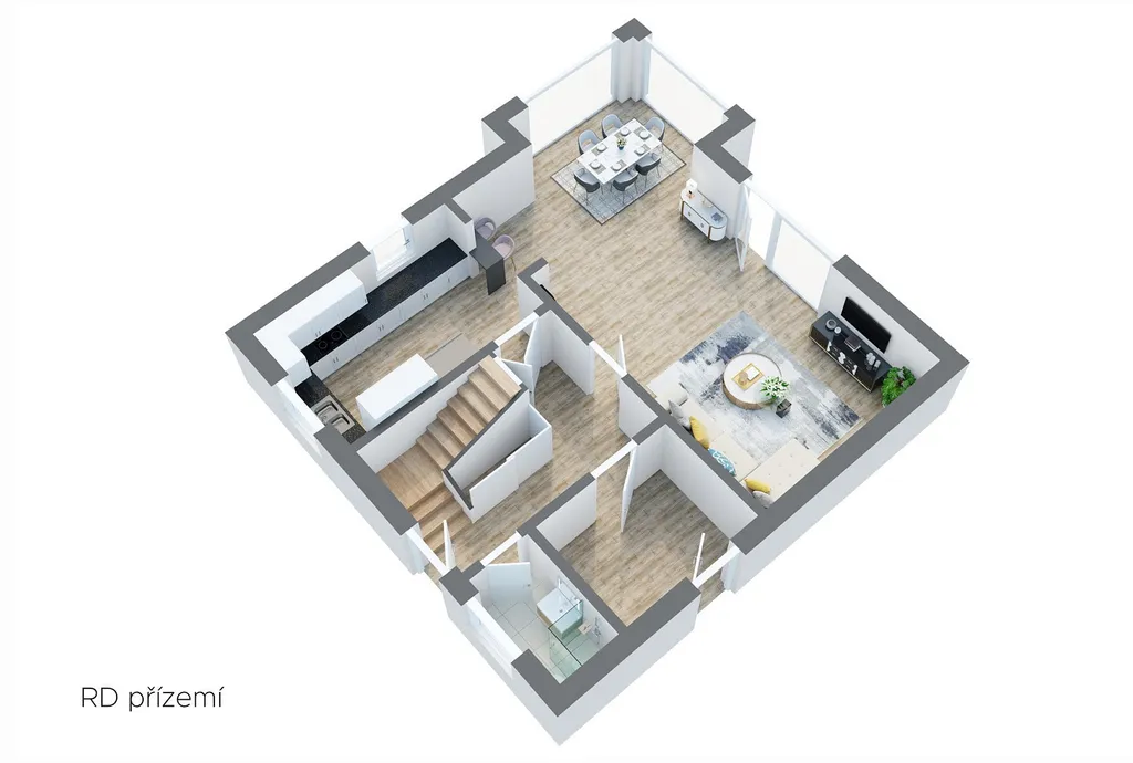 Dispozice domu je 4+1, kde najdete dále dvě koupelny, technickou místnost a půdu, která může do budoucna sloužit pro rozšíření dispozice.