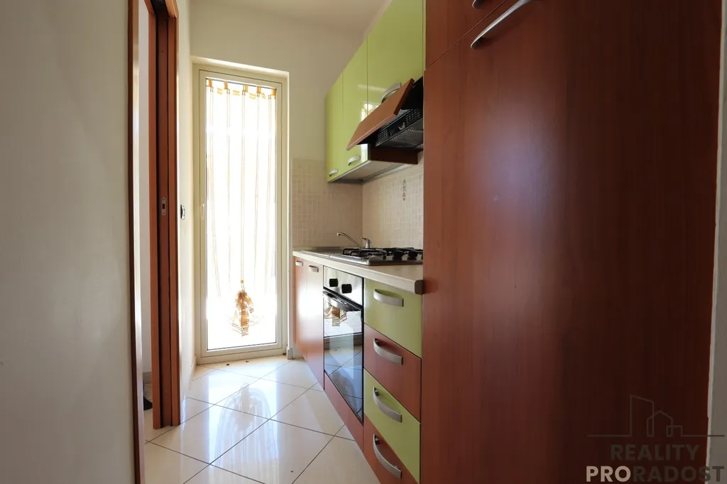 Vstupní část bytu vede do prostorného a světlého obývacího pokoje s oddělenou kuchyňkou, která má přímý vstup na terasu ideální pro venkovní stolování a chvíle relaxace. Klidová zóna, oddělená praktickou chodbou, zahrnuje dvě dvoulůžkové ložnice, z nichž jedna disponuje vlastním balkonem, a koupelnu s oknem a sprchovým koutem.