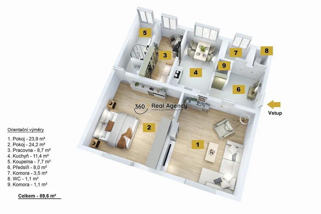 dvou prostorných pokojů a jednoho menšího pokoje (ideálního jako pracovna, dětský pokoj či šatna)