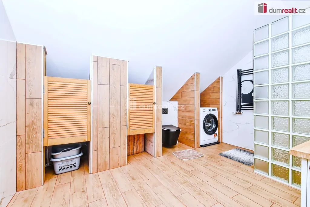 Z chodby vedou dřevěné schody do obytného podkroví (38m²), kde je dostatek místa na hraní a učení, krásná velká koupelna, lůžka a úložné prostory jsou chytře umístěné ve zkoseném prostoru a vedle schodiště volně přístupná pracovna ze které jde udělat další pokoj.