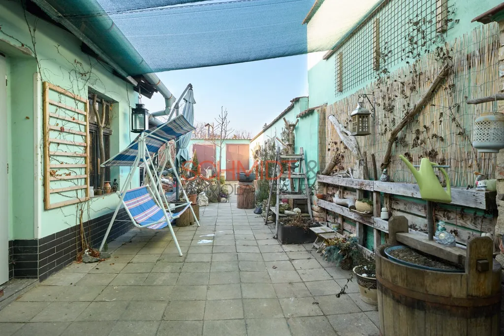 Na dům navazuje uzavřený dvůr, který poskytuje dostatek soukromí. Jeho součástí je vytápěná dílna, kvelbený sklep (2x4 metry), vhodný ke skladování nebo jako vinný sklep, a přímý vstup do dlouhé zahrady. Zahrada je osázená ovocnými stromy.
