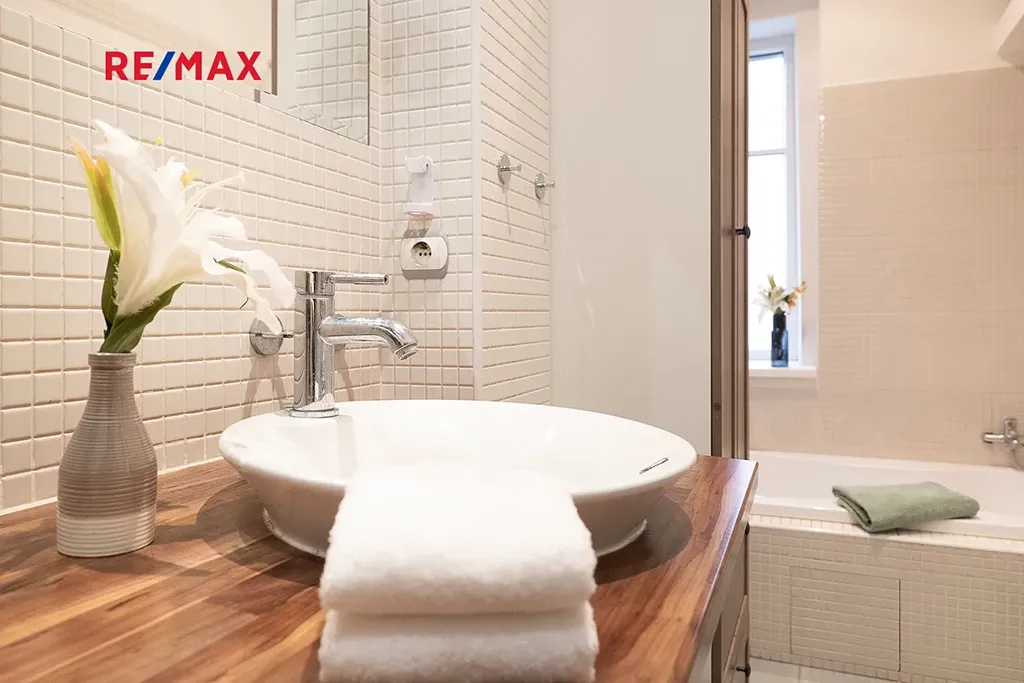 Stylová kuchyňská linka je osazena kvalitními vestavěnými spotřebiči značky Miele. Koupelna je vybavena vanou, pračkou i sušičkou, toaleta je řešena samostatně se závěsným WC. Byt prošel kompletní a citlivou rekonstrukcí zahrnující nové rozvody elektřiny, vody i plynu, moderní osvětlení, kvalitní parketové podlahy v obytných místnostech a dlažbu v předsíni a koupelně.