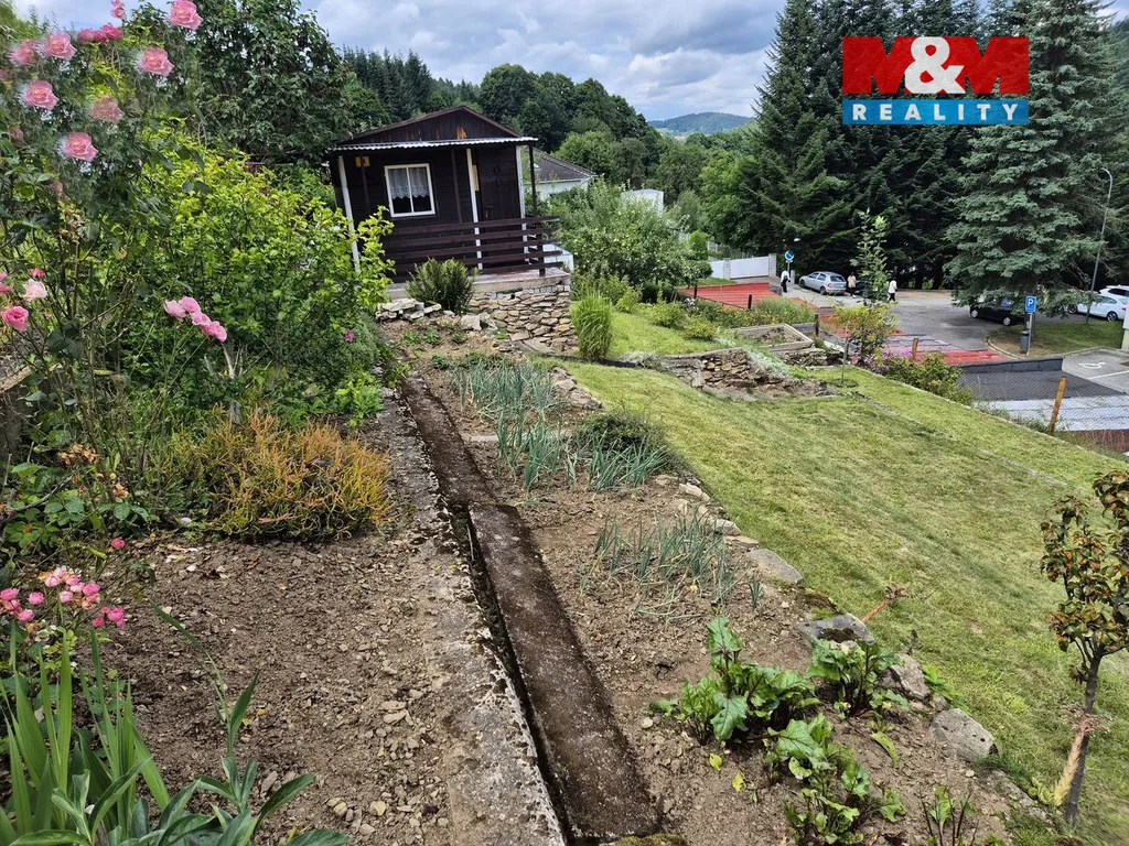 Zahrada je terasovitě řešena do kamenných kaskád a jednotlivé části jsou pohodlně přístupné po nově vybudovaných schodech. Chatka je propojena s nově vydlážděnou terasou se stříškou, která nabízí příjemné místo pro venkovní posezení či grilování.