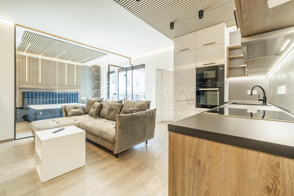 V obývacím prostoru najdete pohodlnou sedací soupravu, televizor a designový jídelní stůl s vestavěnou vinotékou. Kuchyň je součástí obytného prostoru a vybavena vestavěnými spotřebiči značky Miele (myčka, trouba, indukční deska, mikrovlnná trouba a digestoř), které je možné ovládat na dálku pomocí aplikace.