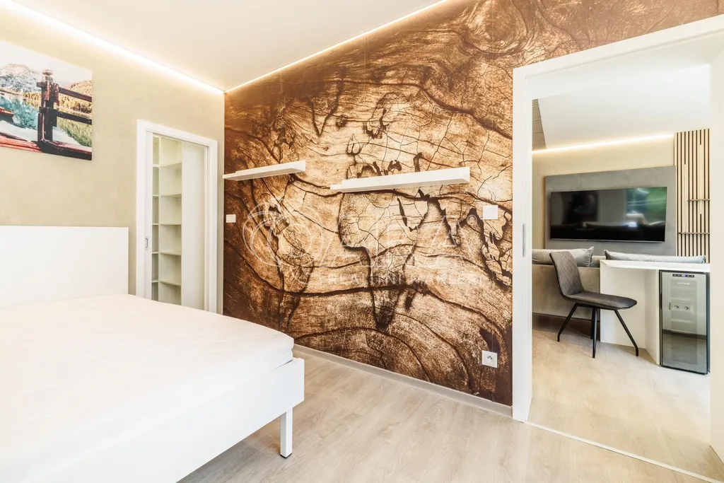 Ložnice je oddělena stylovou prosklenou příčkou, kterou lze zatáhnout elektrickými závěsy pro naprosté soukromí. Je vybavena manželskou postelí s podsvícením na pohybový senzor, velkou šatní skříní a vstupem na balkon orientovaný do klidného vnitrobloku.