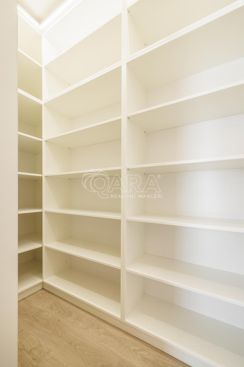 Interiér doplňuje nepřímé LED osvětlení a noční orientační světla. V celém bytě je instalováno podlahové vytápění. V obývací části a hlavní ložnici jsou elektrické zatemňovací žaluzie.