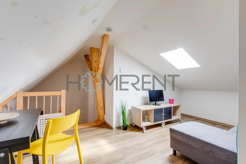 Byt se rozkládá ve dvou posledních patrech domu a nabízí promyšlenou dispozici i dostatek prostoru. Spodní patro tvoří světlý obývací pokoj s plně vybavenou kuchyní a jídelním koutem, prostorná ložnice s množstvím úložného prostoru a moderní koupelna s velkým průchozím sprchovým koutem a toaletou. Schůdky vás zavedou do horního patra, kde najdete útulný pokoj s rozkládací pohovkou a dalším úložným prostorem – ideální jako druhá ložnice, pracovna, pokoj pro hosty nebo relaxační zóna. Samozřejmostí je také pračka.