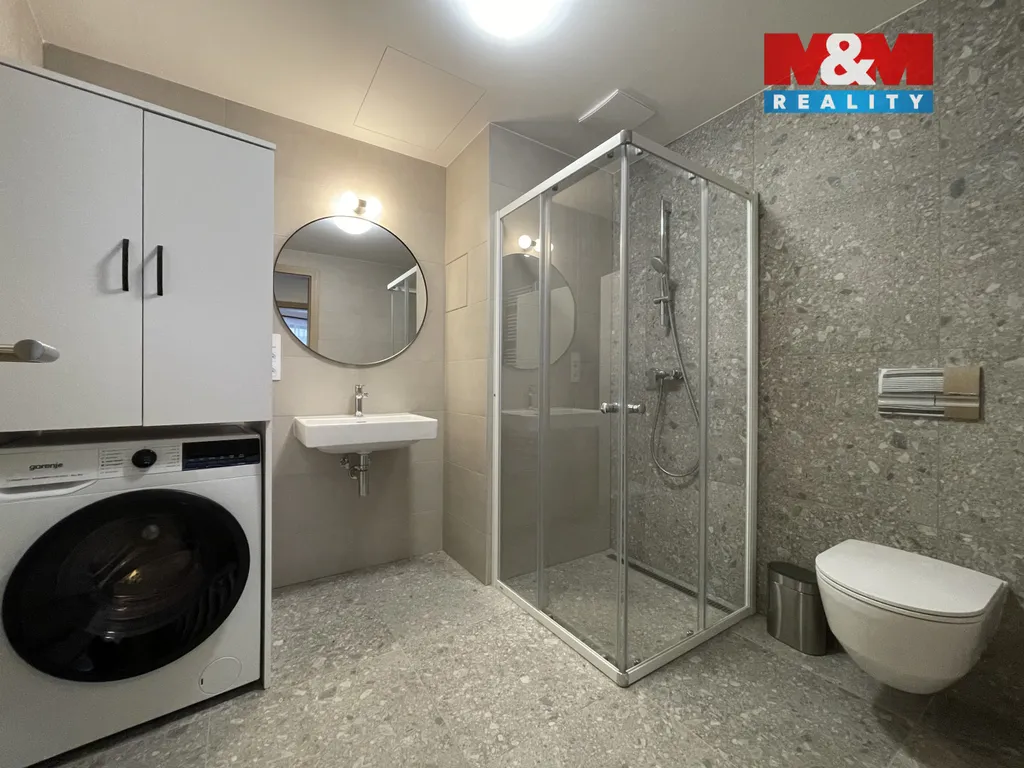 Dominantou bytu je moderní kuchyň vybavená lednicí, troubou, myčkou i mikrovlnnou troubou. Koupelna má kvalitní sanitu, kombinovanou pračku se sušičkou a prostorný walk-in sprchový kout, který dodává bytu luxusní dojem. Ložnice je vybavena vestavěnou skříní a postelí. Velkoformátová okna zajišťují dostatek denního světla a příjemnou atmosféru po celý den.