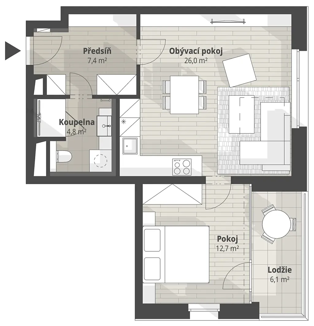 Byt se skládá z prostorné předsíně, koupelny s WC a sprchovým koutem, obývacím pokojem s kuchyňskou linkou a ložnicí s lodžií.