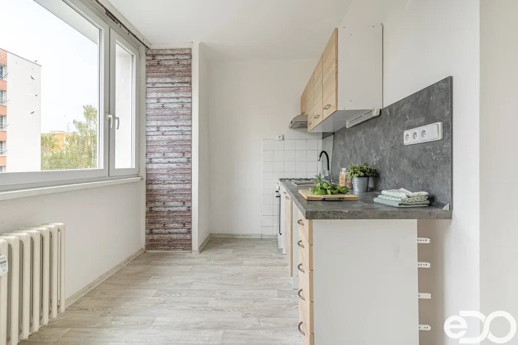 Byt má praktické a funkční uspořádání. Obývací pokoj je průchozí do kuchyně, čímž vzniká přirozený denní prostor. Kuchyně je vybavena kuchyňskou linkou a sporákem.