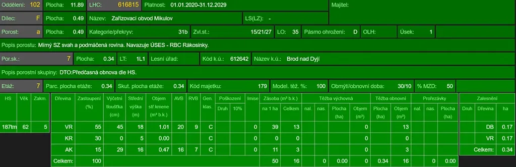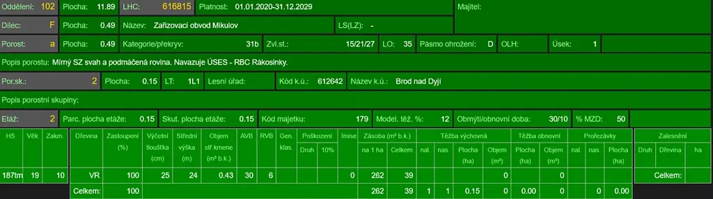 Jedná se o p.č. 4391/6 vedená jako lesní pozemek o celkové výměře 4 945 m2. Zastoupení dřevin dle LHO vrba, keře, akát, stáří lesa 67 let.