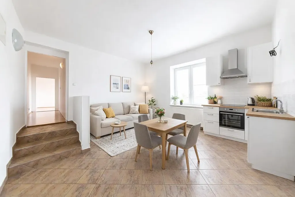 Hlavní obytný prostor tvoří prostorný a světlý obývací pokoj s novým kuchyňským koutem, který přirozeně navazuje na vstupní předsíň. Dispozice bytu je praktická a funkční z chodby se vstupuje do dvou samostatných ložnic, které zajišťují dostatek soukromí a klidu. Koupelna s toaletou je díky francouzskému oknu příjemně prosvětlená denním světlem.