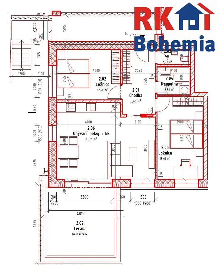 Byt se nachází ve 2.NP dvoupodlažního cihlového domu. Má výměru 89,09 m2 a skládá se z obývacího pokoje s kuchyňským koutem (27,76 m2), pokoje (15,01 m2), ložnice (12,68 m2), koupelny (3,51 m2), samostatného WC (1,73 m2) a chodby (8,4 m2). Z obývacího pokoje je výstup na prostornou terasu (20 m2).