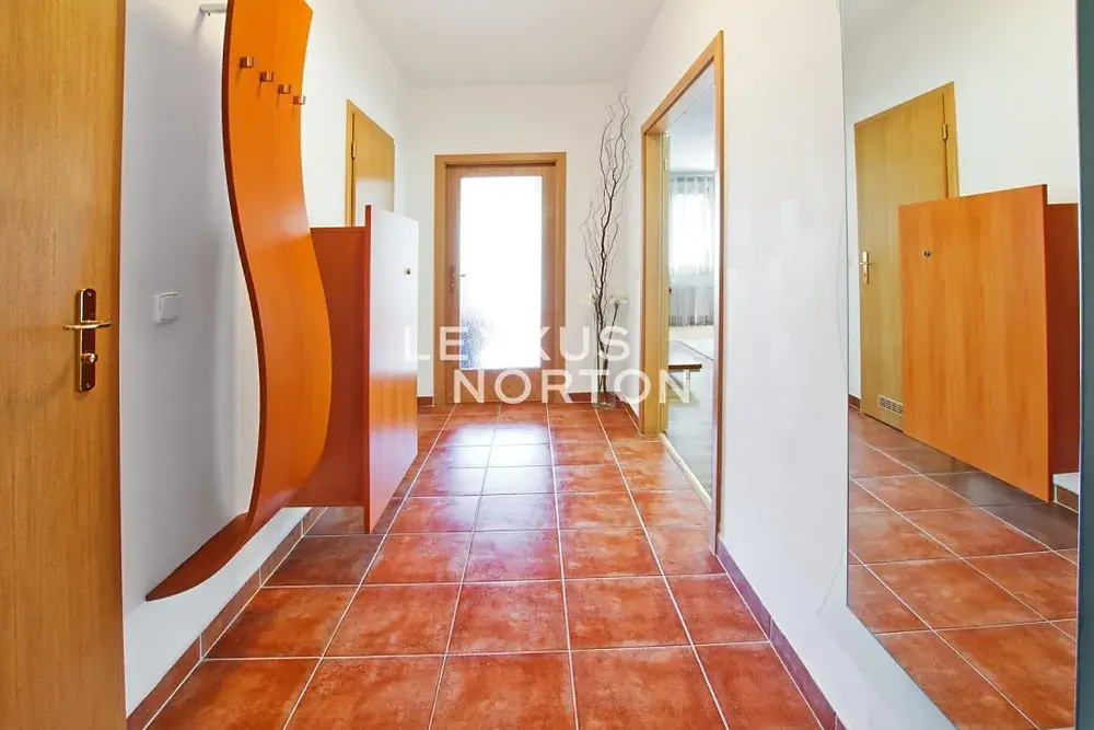 Tento byt k pronájmu dispozičně nabízí vstupní chodbu, prostorný obývací pokoj s kuchyňským koutem, ložnici, šatnu a koupelnu. K bytu náleží garáž a balkon s krásným výhledem do korun vzrostlých stromů.