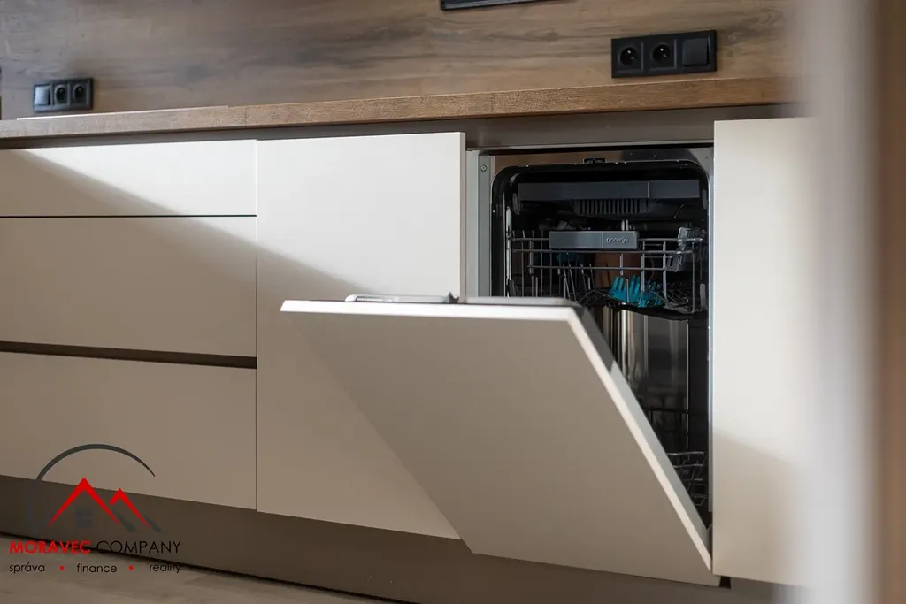 Součástí vybavení je moderní kuchyňská linka s vestavěnými spotřebiči – varná deska, trouba, myčka, lednice a mikrovlnná trouba. V koupelně je sprchový kout a toaleta. Praktickým bonusem je samostatná komora a velké množství úložných prostor.