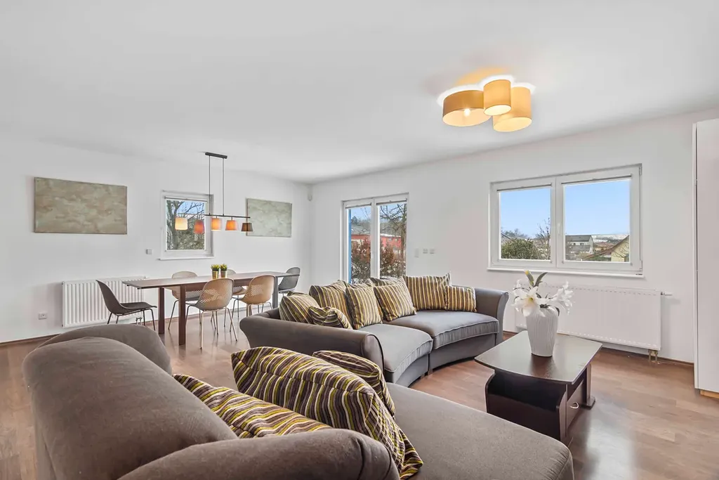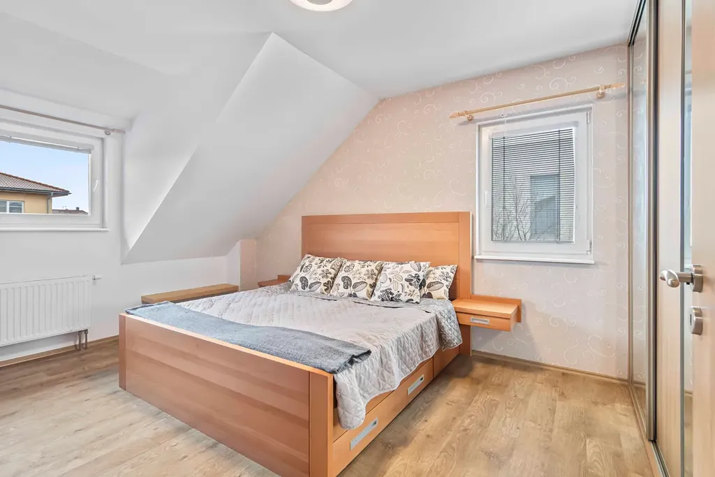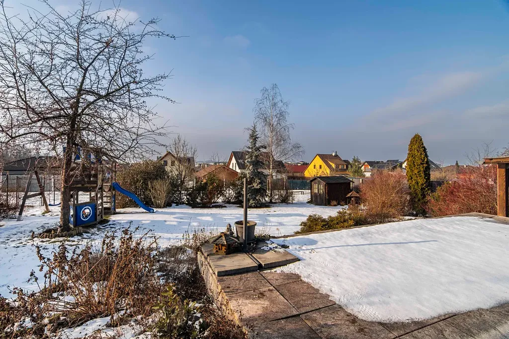Dispoziční řešení domu je velmi praktické a vyhovující rodinnému bydlení. V přízemí se nachází pracovna, prostorný obývací pokoj propojený s kuchyňským koutem, technická místnost a koupelna. Z obývacího pokoje je přímý vstup na dvě terasy o velikosti 2×25 m², z nichž jedna je zastřešená. Terasy plynule navazují na vzrostlou a udržovanou zahradu. V patře domu jsou umístěny dva dětské pokoje, ložnice, praktická šatna a druhá koupelna s vanou a WC. K dispozici jsou dva půdní prostory. Z prvního vznikla podkrovní herna pro děti a druhý nad garáží slouží jako velkorysý úložný prostor pro sezónní věci.