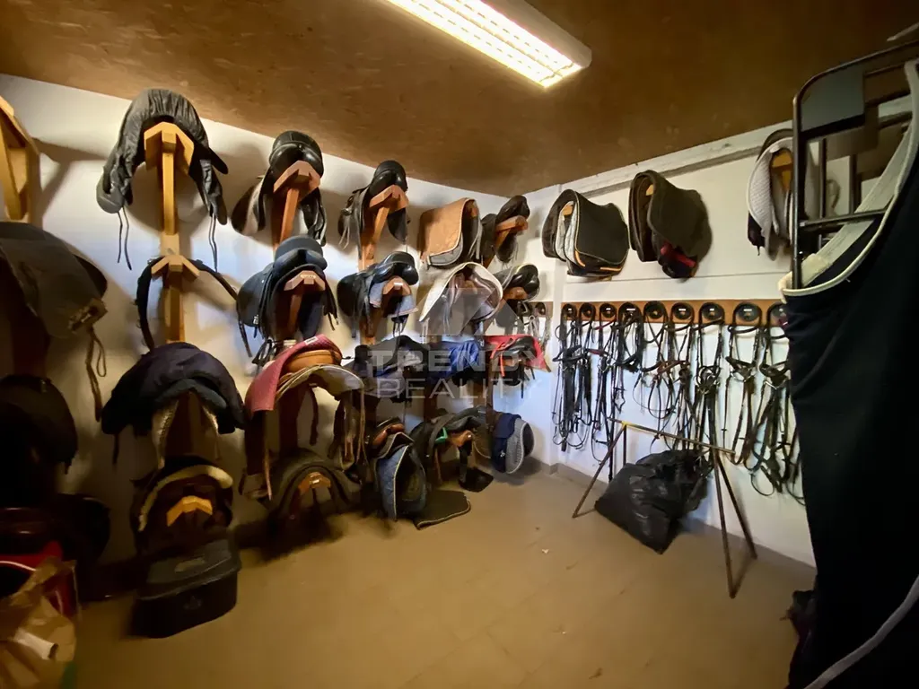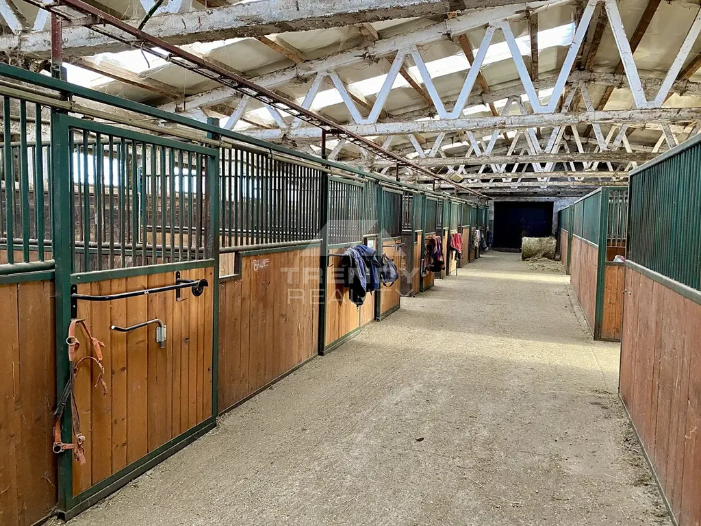 Dále jsou zde, vnitřní stáje s 23-ti kompletně vybavenými prostornými vestavnými boxy o ploše 490 m², sedlovna se šatnou a sociálním zázemím, klubovna, garáž na traktor, vnitřní krytá jízdárna o rozměrech 13x30m s kvalitním povrchem písek + geotextílie o ploše 390 m², venkovní jízdárna přípravou na osvětlení o rozměrech 37x52m s možností zvětšení s kvalitním povrchem písek + geotextílie a kvalitním drenážním systémem. Je zde i sklad překážek s kompletním skokovým vybavením na parkur o celkové ploše 1.860 m², seník s kapacitou 220 balíků sena o průměru 150 cm a sklady krmiva, pilin a dřeva. Na pozemku je umístěn podzemní rezervoár na dešťovou vodu k zajištění kropení venkovní jízdárny v letním období o kapacitě 60.000 litrů.
