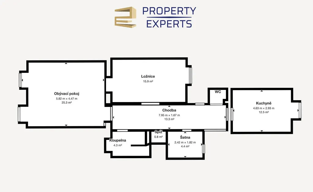 Byt o se nachází v 1. patře (2. NP) rekonstruovaného bytového domu. Užitná plocha bytu 72 m² poskytuje dostatek prostoru pro pohodlné bydlení. Mimo obytné místnosti (obývací pokoj a ložnici) nabízí byt také velkorysé úložné prostory v podobě samostatné komory a šatny o rozměru 4 m².