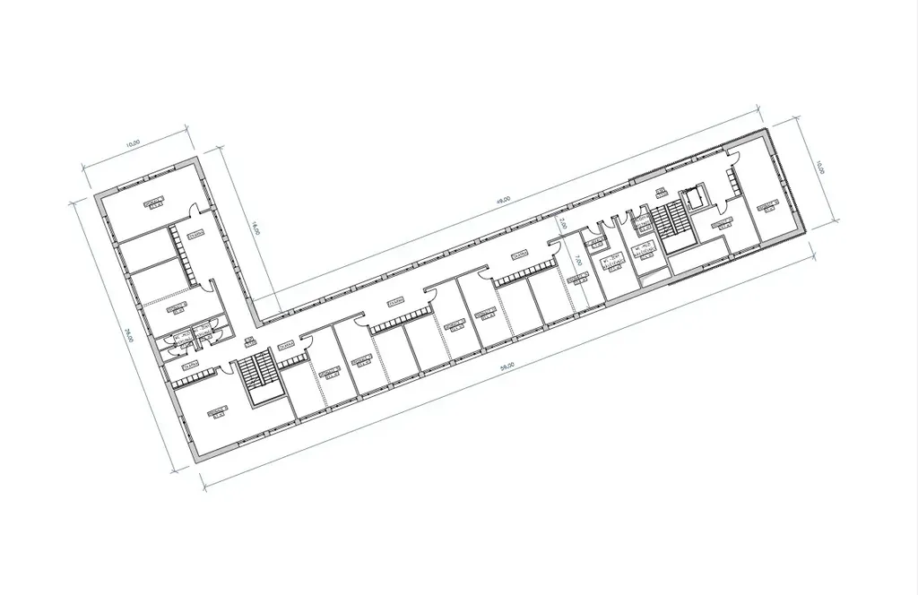 Dispoziční řešení je navrženo s ohledem na funkční provoz, bezbariérový přístup a jasné oddělení pohybu pacientů a personálu. V přízemí se nachází vstupní lobby s recepcí, čekárnami, toaletami a základním zázemím. Vyšší podlaží jsou určena pro odborné ordinace, vyšetřovny a administrativní prostory. Studie umožňuje flexibilní přístup podle zvoleného scénáře výstavby – varianta A počítá se dvěma nadzemními podlažími a hrubou podlažní plochou cca 1 348 m², varianta B se třemi nadzemními podlažími a plochou přibližně 2 086 m².