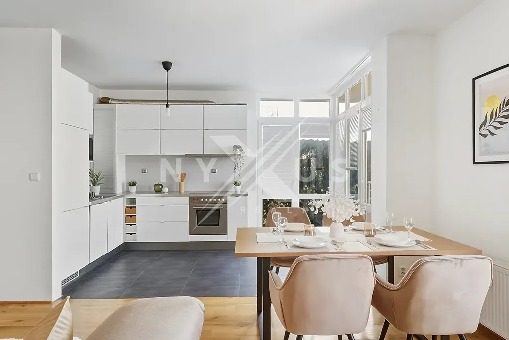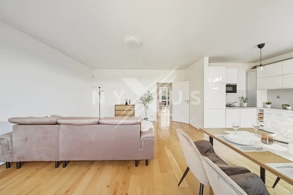 Dominantou bytu je velkorysý obývací pokoj s kuchyňským koutem o rozloze 36,1 m², vybavený francouzskými okny orientovanými na západ, díky nimž je interiér po celý den krásně prosvětlený a plynule propojený s terasou.