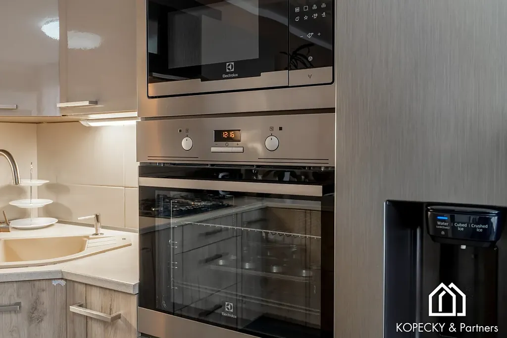 Součástí prodeje je kuchyňská linka včetně spotřebičů: myčka, plynový sporák, elektrická trouba a americká lednice. Byt je připraven tak, aby nový majitel mohl fungovat prakticky okamžitě bez řešení základního vybavení. Podlahy jsou řešeny kombinací dlažby a laminátových podlah, což je ideální jak z hlediska údržby, tak z hlediska pohodlí v obytných místnostech.