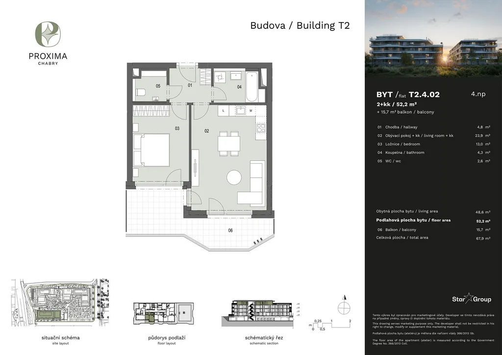 Tento byt 2+kk o velikosti 52,2 m² se nachází ve 4. podlaží terasového bytového domu nové etapy Proxima – moderního rezidenčního areálu navazujícího na oblíbené Nové Chabry. Díky velkým oknům, nadstandardnímu prosvětlení a promyšlenému urbanistickému řešení nabízí tento byt prostředí, které si okamžitě zamilujete. Byt se také pyšní prostorným balkonem o velikosti 15,7 m² s výhledem do okolí.