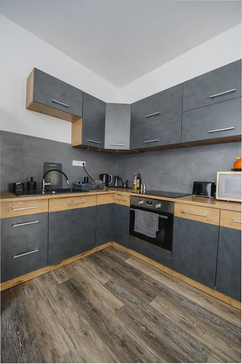 Kuchyňská linka je rohová s vestavěnými spotřebiči ( elektrická varná deska, elektrická trouba), v kuchyni jsou také 2 okna. Byt je tedy slunný a světlý. Byt v posledních 3 letech prošel kompletní rekonstrukcí. Jsou zde nové podlahy, včetně izolace, nová elektřina, nové štuky, dveře, okna. V bytě je rekuperace. Byt má vlastní topení ( elektrokotel ).Náklady na elektřinu cca 2.500,-Kč / měsíčně. V domě je plyn, plynová přípojka je hned před bytem - možnost připojení i na plyn. V domě je založené SVJ a postupně zde proběhli i společné opravy. U domu je zahrada, parkování je před domem. K bytu patří sklepní koje v suterénu domu.