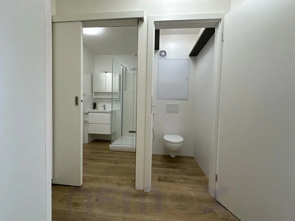 Na šatnu navazuje samostatná koupelna se sprchovým koutem a umyvadlem, v koupelně je pračka i s napojením (voda+odpad).