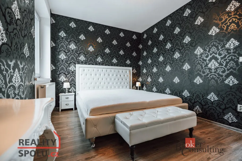 V horním patře se nacházejí dva samostatné pokoje, druhá koupelna a prostorná terasa. První pokoj je koncipován jako ložnice vybavená moderní postelí, útulnou lenoškou a designovým lustrem. Další místnost je využívána jako prostorná šatna. Druhá koupelna nabízí vanu, toaletu, pračku se sušičkou, která je efektivně zabudovaná v uzavíratelné skříni a neruší tak celkový vzhled interiéru dané místnosti. Součástí terasy je venkovní posezení včetně grilu.