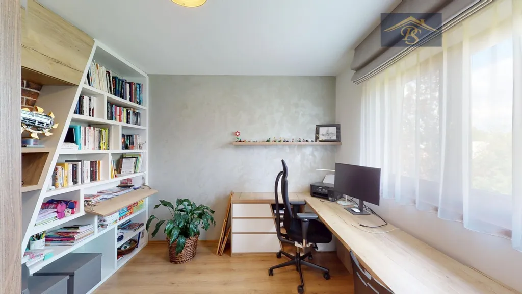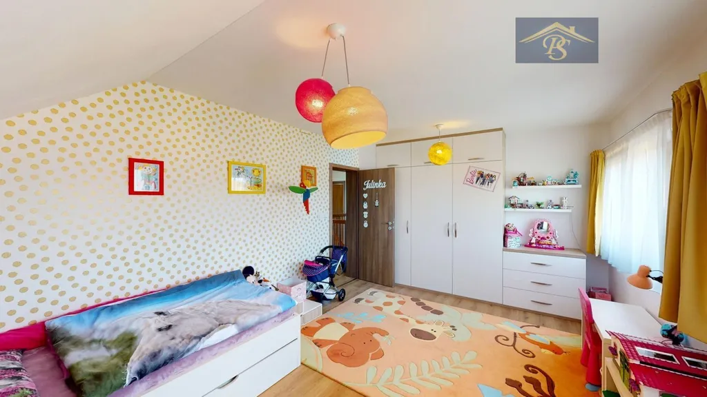 V patře se nacházejí čtyři samostatné pokoje, šatna a koupelna s vanou.