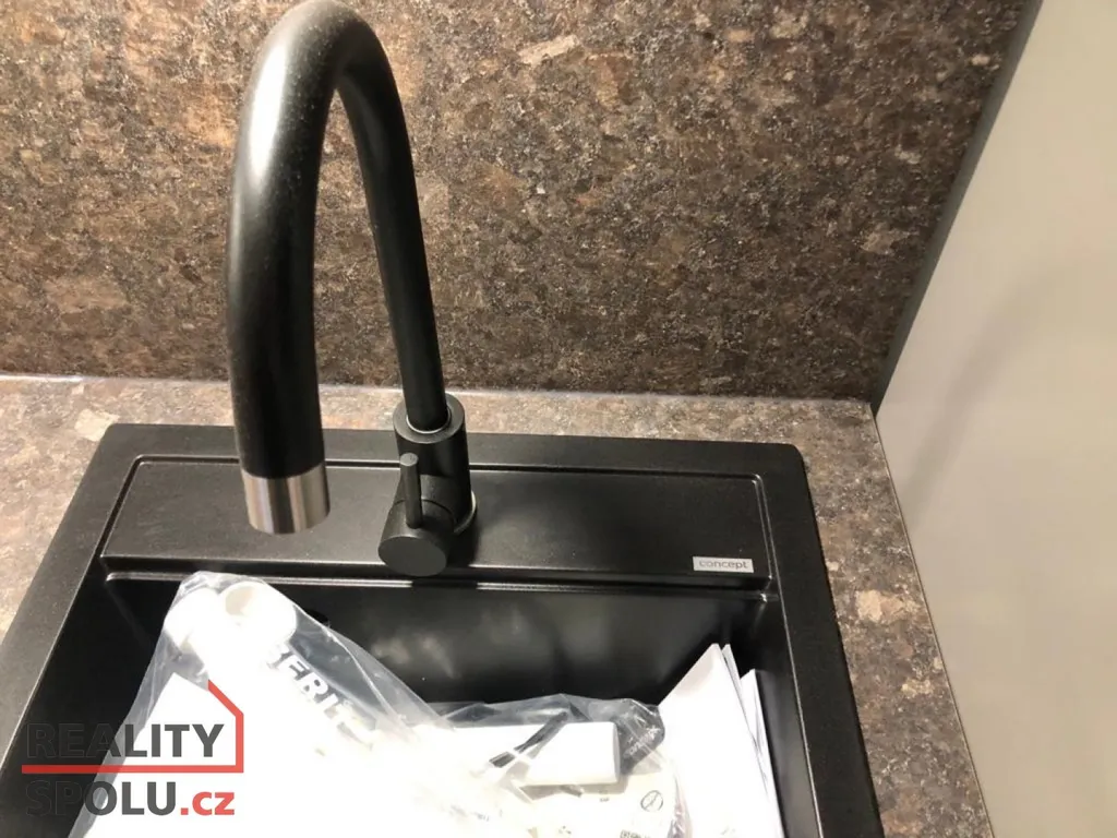Kuchyň je řešena moderní linkou s vestavěnými spotřebiči – indukční varná deska, elektrická trouba, digestoř, myčka nádobí a lednice.