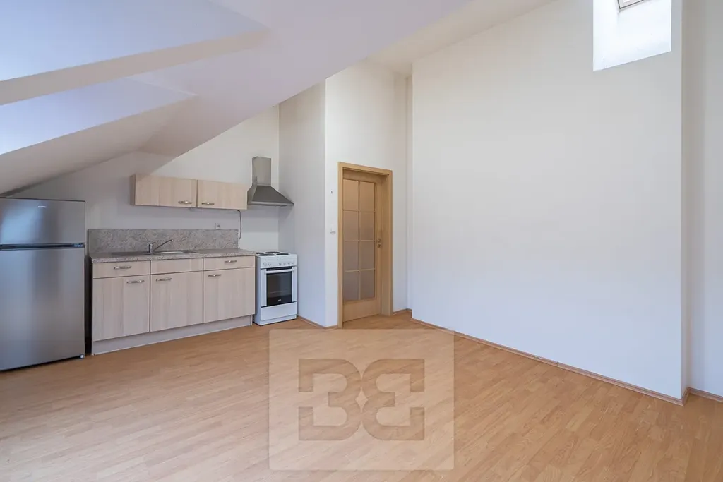 Dispozice bytu nabízí prostorný obytný prostor s kuchyňským koutem, který je vybaven lednicí a sporákem. Díky střešním oknům je byt světlý a nabízí výhled na okolní zástavbu.