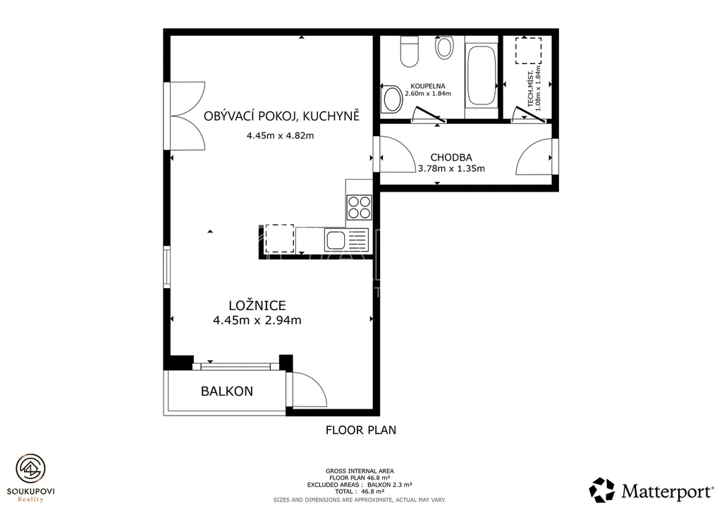 Byt je aktuálně řešený jako 1+kk, ale díky praktickému uspořádání ho lze jednoduše upravit na 2+kk. Vznikne tak plnohodnotné bydlení třeba pro pár, jednotlivce nebo i menší rodinu. Prostorná koupelna je vybavena vanou, WC a bidetem.