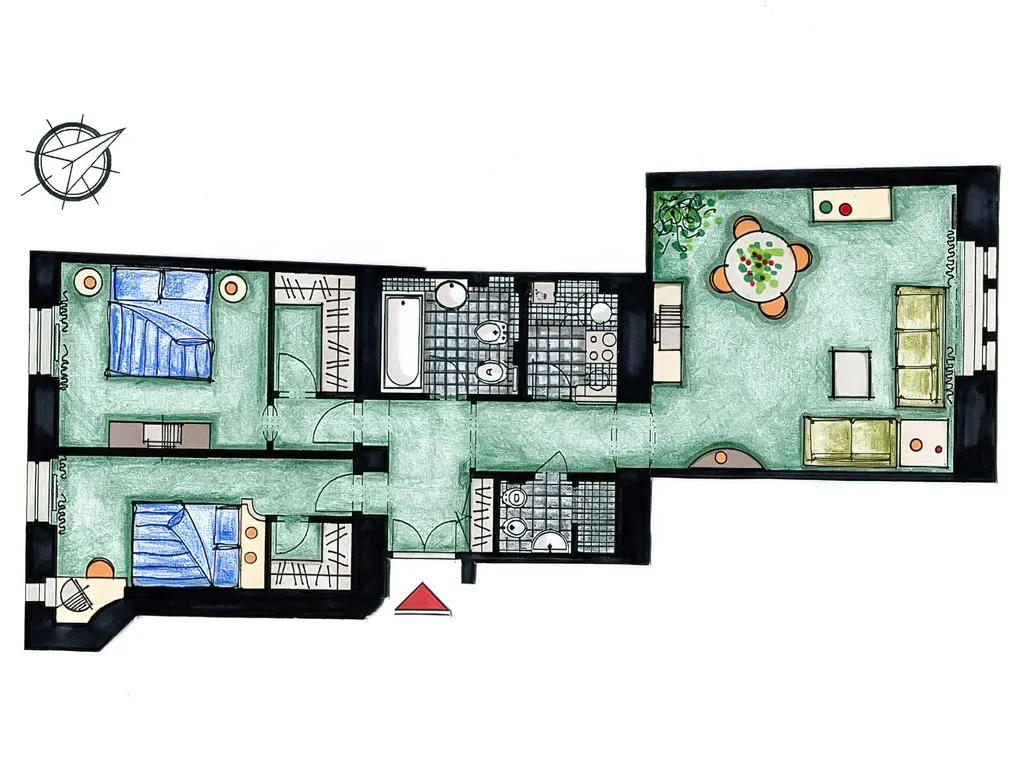 Byt o rozloze 87 m2 zahrnuje obývací pokoj s jídelním koutem, samostatná plně vybavenou kuchyň včetně mikrovlnné trouby, myčky na nádobí a pračky. Obrázek kuchyně v inzerátu byl pořízen z velmi podobného bytu. Dále jsou 2 ložnice, z nichž každá má vlastní šatnu. V bytě také jsou hned 2 koupelny — hlavní koupelna s vanou a druhá je se sprchovým koutem.