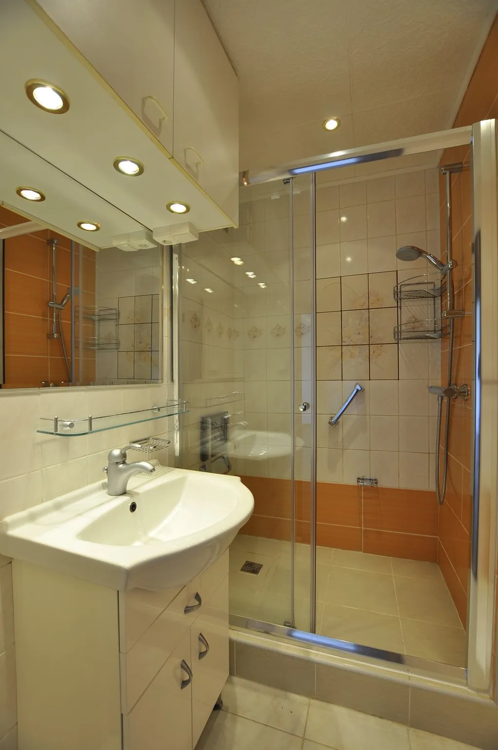 Plocha bytu 77 m2 v 5. nadzemním podlaží nabízí, dostatečně velkou vstupní chodbu (12,12 m2), obývací pokoj (18,17 m2) se vstupem na lodžii (3,20 m2), dětský pokoj (12,17 m2), ložnice (16,40 m2), kuchyň (11,65 m2) s nově zařízenou kuchyňskou linkou, samostatné WC (1,03 m2) a koupelnu se sprchovým koutem a vanou (2,85 m2). V celém interiéru jsou zhotoveny dřevěné posuvné dveře.