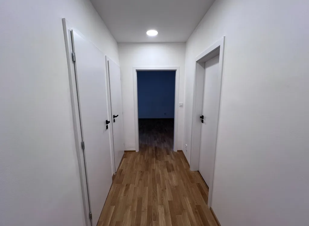 Dispozice bytu: prostorná předsíň, koupelna, samostatné WC, komora, ložnice a obývací pokoj s kuchyňským koutem orientovaná do vnitrobloku. Dům má udržované společné prostory a menší vnitřní dvůr, který je k dispozici pro obyvatele domu.