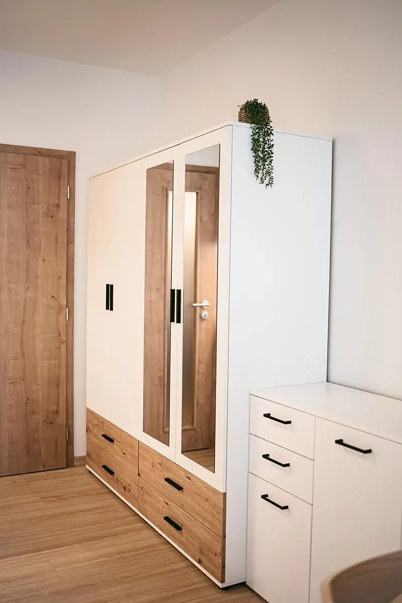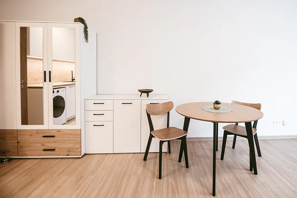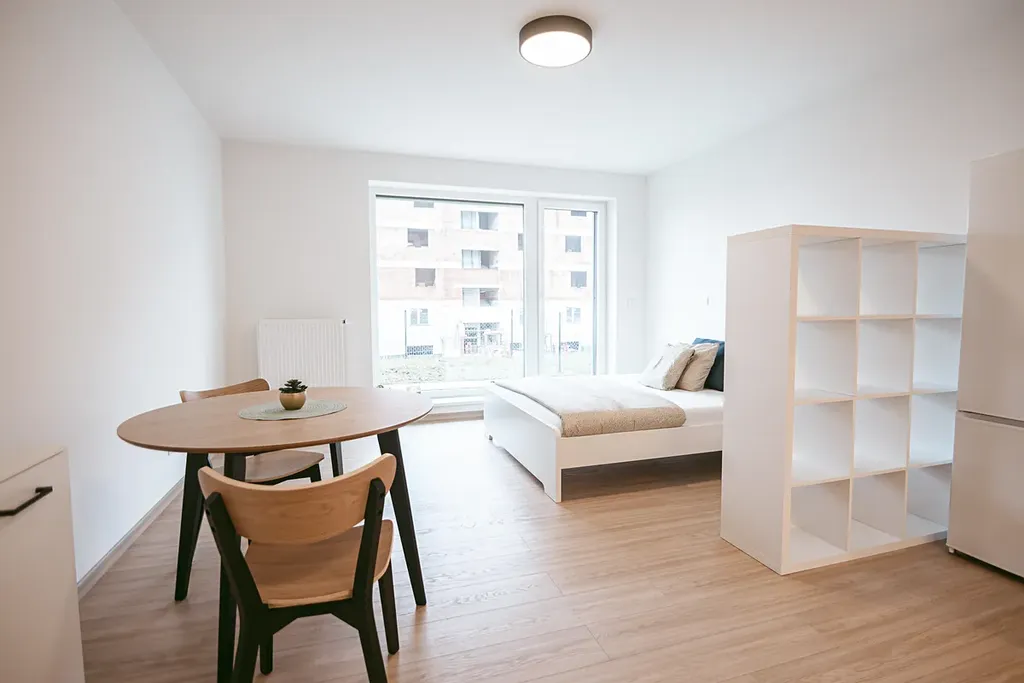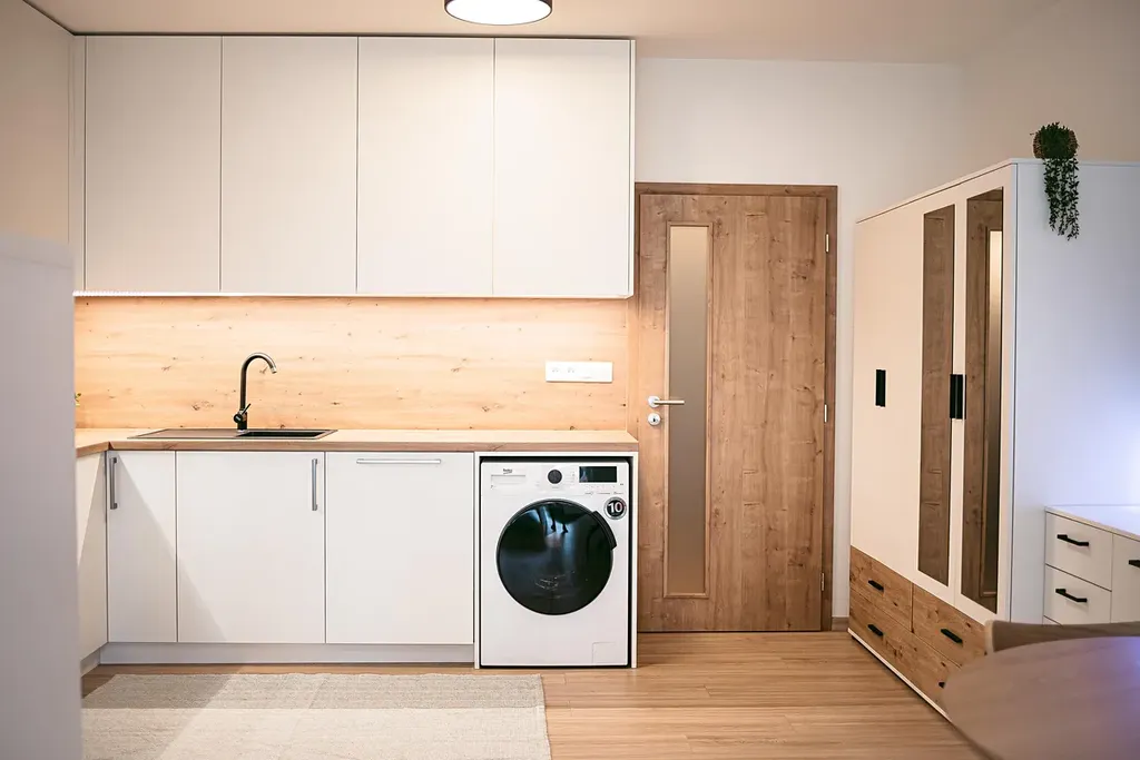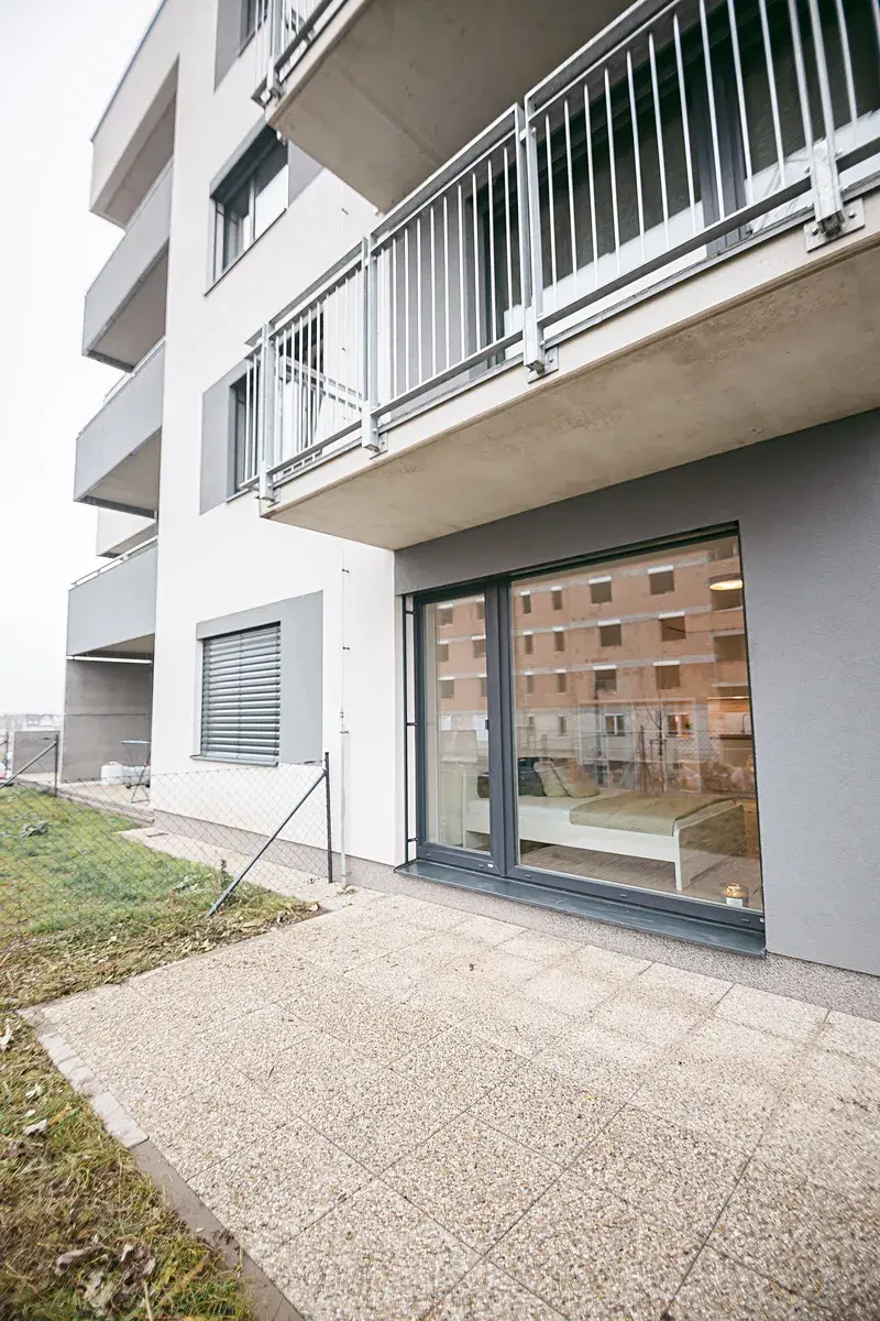 Interiér bytu tvoří hlavní obytná místnost s kuchyňskou linkou, koupelna se sprchovým koutem a toaletou a vstupní chodba. Z hlavní obytné místnosti je přímý vstup na terasu a předzahrádku. Díky velikému francouzskému oknu, které je situováno na jih budete mít ve Vašem novém domově slunce po celý den. O soukromí se postarají venkovní elektrické rolety. Truhlářem na míru vyrobená kuchyňská linka disponuje kvalitními vestavěnými spotřebiči – myčkou, troubou na pečení, pračkou a volně stojící lednicí s mrazákem. O úložný prostor se bát nemusíte. V bytě je prostorná šatní skříň, odkládací komoda se šuplíky a policová skříňka oddělující prostor kuchyně od manželské postele s matracemi. V kuchyňské části je kulatý jídelní stůl se židlemi. Atmosféru dokresluje plovoucí podlaha s dřevěným dekorem. Součástí nabídky je prostorný sklep a venkovní parkovací stání.