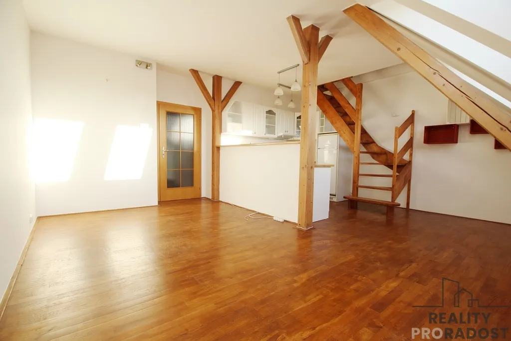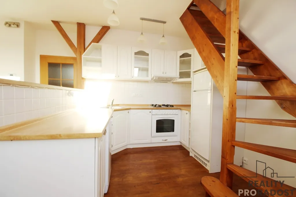Dispozice: Mezonetové řešení nabízí jasné oddělení společenské a soukromé zóny, což bytu dodává pocit vzdušnosti a soukromí.