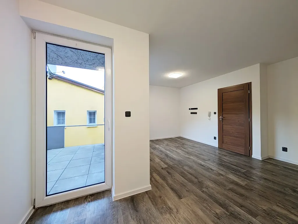 Byt je situován v moderní novostavbě zasazené do svahu, která má unikátní členění a díky tomu nabízí u takto malého bytu například terasu.